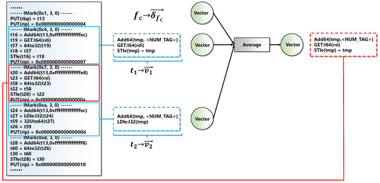 For functions in the data repository, we map each function f c into a numeric vector δ f c R d . Each dimension of δ f c is initialized to a small random value near zero. Similarly, we map each token of the data repository into a vector v R d . Unlike references [18,26], each token in GeneDiff consists of several VEX instructions from the same assembly instruction. For example, t 1 in Figure 6 consists of three VEX instructions (after deletion). These VEX instructions come from the same IMark(0x4, 3, 0), where an IMark represents an assembly instruction. The initialization method of v is the same as that of δ f c .