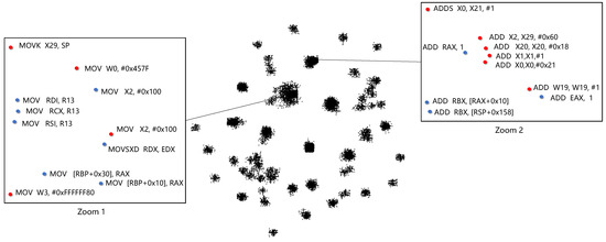 In this subsection, we show the relevance of instructions from different ISAs, AMD64 and AArch64 using GeneDiff. First, we use the training dataset to train the representation model; the dimension of the instruction vector d is 100, and the number of iterations ( i t e r a t i o n ) is 50. Then, we extract the numeric vectors of the combinations of VEX instructions from the trained model and establish a map M: assembly instructions → combinations of VEX instructions → vectors. After obtaining the numeric vectors for each assembly instruction via the map M, we utilize T-SNE [31] for visualization. T-SNE can map high-dimensional vector spaces into two dimensions via nearest neighbour approximation, where a smaller geometric distance indicates a higher lexical semantic similarity. Figure 7 shows the relationship between assembly instruction vectors mapped onto a two-dimensional space. From Zoom 1 in Figure 7, the numeric vectors of the m o v family instructions from different ISAs are mapped together in two-dimensional space. In zoom 2, the numeric vectors of the a d d family instructions from different ISAs are also grouped together in two-dimensional space.