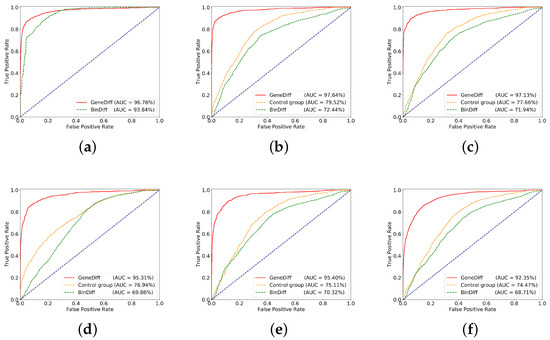 Figure 8. The receiver operating characteristic (ROC) evaluation results based on the test datasets, where the x-axis is the true positive rate and the y-axis is the false positive rate. (a) Same instruction set architecture (ISA), cross opts; (b) cross ISAs, O0; (c) cross ISAs, O1; (d) cross ISAs, O2; (e) cross ISAs, O3; (f) cross ISAs, cross opts.
