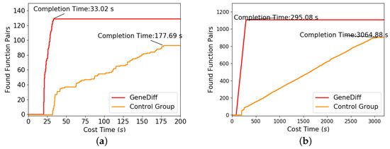 We compiled binutils-2.32 and OpenSSL-1.0.1f into binaries of different ISAs (i.e., AMD64, AArch64, and MIPS64). Then, these binaries were divided into several file pairs according to their file names. We used GeneDiff and the control group to detect file pairs and logged the time taken to detect each function pair. We found that GeneDiff generally completed the task in much less time than did the control group. Figure 9 shows the experimental results of two approaches for detecting the sysinfo file in binutils-2.32 and the libssl file in OpenSSL-1.0.1f; the red line denotes GeneDiff. There are a total of 137 function pairs in the sysinfo file. GeneDiff successfully found 129 of them in 33.02 s, whereas the control group found 93 pairs in 177.69 s. Since the two approaches preprocess the target binaries via IDA Pro [29], the function pairs are not found in either of the approaches in Figure 9 during the initial time period. However, GeneDiff’s preprocessing time was shorter than that of the control group, and its detection efficiency was much higher than that of the control group. This is because GeneDiff only converts bytecode into VEX instructions and trims out redundant data during preprocessing, which makes the implementation faster. GeneDiff leverages the lexical semantics based on the intermediate representation rather than on symbolic execution: the former is more scalable and less vulnerable to adverse effects from the differences in architectures and compiler optimization options.