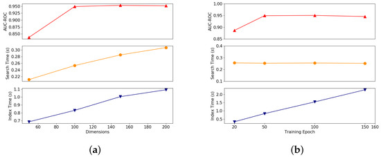 Figure 10. The impacts of dimensions and number of epochs on detection performance. From top to bottom, the Y-axes are the area under the curve (AUC) of the ROC score, search time and indexing time. (a) Dimensions; (b) Epoches.
