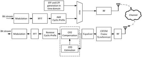 The OFDM system is a special form of frequency-division multiplexing that divides the high rate stream into lower date streams called sub-streams, and simultaneously transmits all sub-streams through orthogonal subcarriers. In OFDM systems, the cyclic-prefix (CP) is added as the guard interval to combat inter-symbol interference (ISI), which seriously affects high rate systems due to multipath fading. Furthermore, the cyclic-prefix interval does not carry a signal, and it can reduce the system performance. Therefore, the length of the CP must be carefully chosen to balance between ISI reduction and effective performance. The principle disadvantage of OFDM is its sensitivity to frequency offsets caused by the Doppler shift and the asynchronous frequency of the local oscillators (LOs), which are also known as carrier frequency offsets (CFO). A CFO is a non-ideality in the baseband system design, which occurs when the LO signal in the receiver does not match the carrier signal in the transmitter. This phenomenon can occur in two cases: (i) frequency mismatch in the transceiver oscillators, and (ii) the Doppler effect as the transmitter and the receiver move relative to each other. When the CFO becomes present in the OFDM system, there is a frequency shift in the receiver’s signal, which leads to non-orthogonality among the subcarriers. This can result in inter-carrier interference (ICI). The CFO includes two parts: integer frequency offset (IFO) and fractional frequency offset (FFO). IFO causes a circular shift of the subcarriers on the receiver side, which causes a significant degradation in the bit error rate (BER) performance. However, it does not destroy the orthogonality among the subcarrier frequency components; therefore, ICI does not appear. The presence of FFO will destroy the orthogonality among the subcarriers [