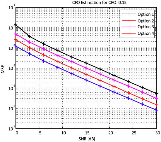 Figure 5 evaluates the CFO estimation effectiveness of the CP method using four options based on the mean-squared error algorism. From Equation (15), the estimated value of the CFO will be better if the DFT windows sizes are larger.