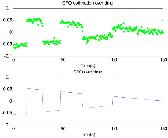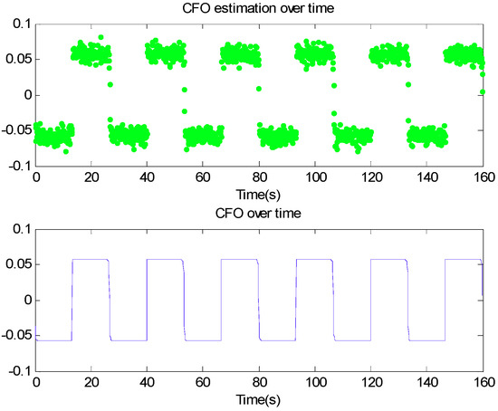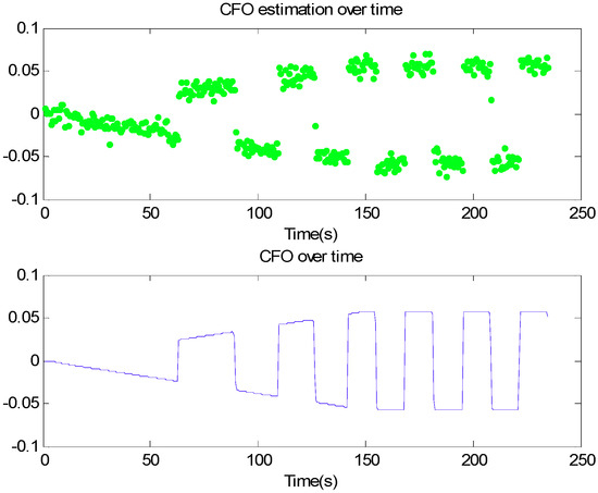 Figure 8 represent the simulated CFO over time and the estimated CFO over time by using the CP algorism shown in Equation (15) with three cases. We can see that the CFO value and the Doppler shift are proportional. If the value of CFO changes during the transmission time, then we need a technique that can estimate the CFO in real time to compensate the CFO and then, increase the system performance. In our proposed scheme, the CP technique can exactly estimate the CFO value for every 120 us of the OFDM symbol frame. Therefore, the CP technique is suitable for the system when the shape of the estimated CFO value is the same as the shape of the practical CFO in real time. In addition, their values are the same and show the effectiveness of the proposed algorism in real time.
