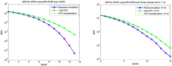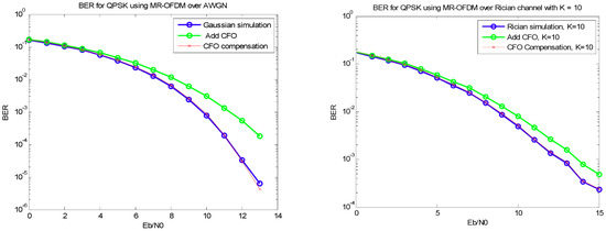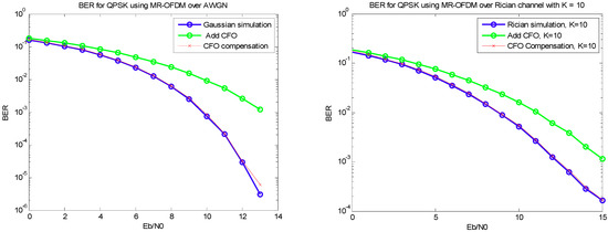 In this section, we use the CP method to estimate and compensate for the CFO in MR-OFDM; this simulation is based on the characteristic parameters shown in