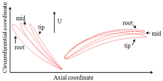 The rotor stage of a low-speed axial compressor test rig shown in Figure 1 in Beihang University [12] was applied in this analysis. The test rig consists of a 13-blade stator row and a 19-blade rotor row with the C4 profile (Figure 2). At the mid-span, the rotor blade has a chord length of 52 mm, a solidity of 0.605, a stagger angle of 34.49 degree, and an outlet angle of 41.99 degree. The design speed of the test rig is 3000 rpm, and the mass flow is 2.40 m3/s at the design point with a total pressure rise equal to 1500 Pa. A detailed introduction of the test rig is presented in Li [12] and Zhang [20]. In this study, a blade cascade extended from the rotor’s mid-span profile was applied as the compressor test model. The length in the vertical direction was set as 20% span according to the literature.
