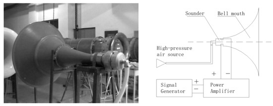 An axial total pressure fluctuation in the inlet boundary was added as the source of unsteady excitation, which was set to physically imitate the periodic sound excitation generated by pneumatic speakers. The schematic plot of the sound generator and the figure in the experiment by Li [12] are shown in Figure 3.