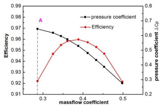 where Δp was pressure raise, Um was the rotational speed at midspan, and ρ was the density.