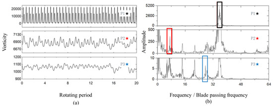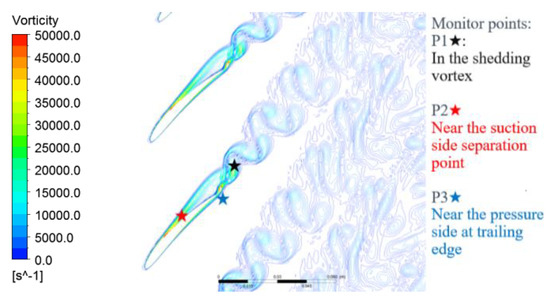 The vortex shedding phenomenon at the blade trailing edge, which was physically similar to the Karman vortex street, could be described as that separation vortices on the two sides of the blade combined with each other at the trailing edge with different vorticity directions, and then shed off in pairs when the balance of vorticity was obtained. Analyzed from this physical mechanism, three different types of unsteady flows existed in the flow field: Shedding vortex, suction-side separation vortex, and pressure-side separation vortex. To obtain the characteristic frequencies of the three inherently unsteady flows, the analysis on vorticity fluctuations on monitor points P1, P2, and P3 (marked in Figure 6) was conducted. The vorticity fluctuations in the time domain and corresponding spectrum analysis at the three monitor points at working point A are shown in Figure 7.