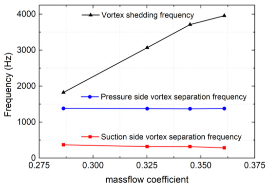 Variations of the frequencies to mass-flow coefficients are shown in Figure 8 for the three types of unsteady separation flows. It could be concluded that the vortex shedding frequency Fshed varied more than 100% with mass-flow coefficients, while the frequencies Fps and Fss were insensitive to the variation of working conditions.