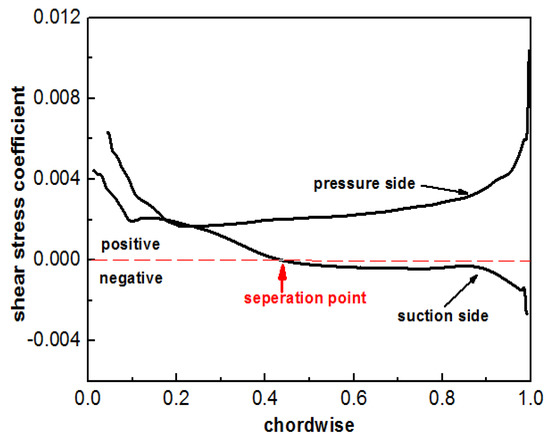 Time-averaged wall shear stress distribution on the rotor blade surface at working point A is shown in Figure 9. The separation position on the suction side was identified where the wall shear stress on the suction side switched from positive to negative. At working point A, the flow on the suction side separated at 43.5% of the chord length from the leading edge. Figure 10 shows the variation of separation positions to the mass-flow coefficients. The y-axis label of the separation position was the chordwise of the blade. The vortices separated almost at the trailing edge of the blade in the large flow rate. The separation on the suction-side separation emerged distinctly when the mass-flow coefficient was less than 0.42. And the separation position moved towards the leading edge with the decrease of the mass-flow coefficient because of the increase in the blade attack angle.