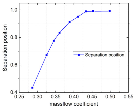 Since DES results can be sensitive to grid resolution, four sets of mesh solutions with the same topology were studied to guarantee the accuracy of results. The Y-plus of the meshes near the blade surface were kept smaller than one in all four cases. The separation positions were chosen as the reference of shedding vortex structure (identification of separation position would be described in Section 4), and the results with the four meshes were shown in Figure 4. When the amount of mesh grids exceeded 7.36 million, the simulated separation positions were beginning to converge. Therefore, the mesh solution with 7.36 million mesh grids was chosen as the basic solution, which contained 347 nodes in the axial direction, 134 nodes in the pitchwise direction, and 125 nodes in the spanwise direction near the blade region.
