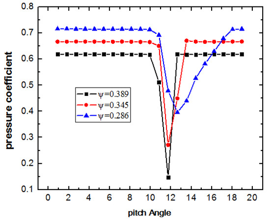Figure 11. Pressure distribution at pitchwise to different mass-flow coefficients.