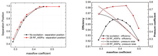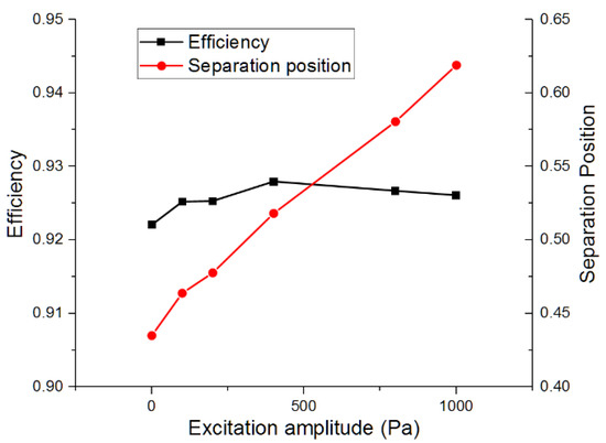 Figure 12. Influence of excitation amplitude on efficiency and separation position.