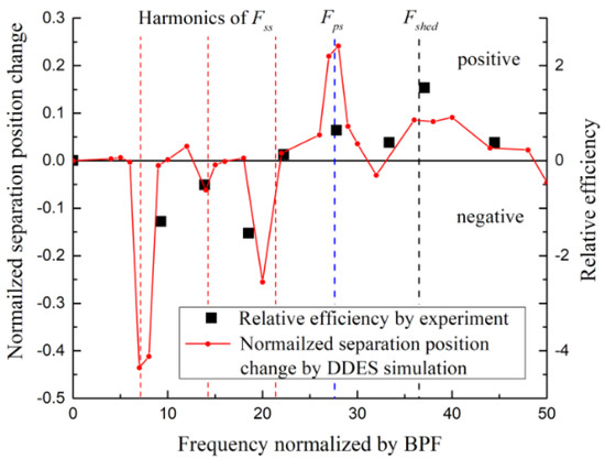 Then the frequency of excitation was varied from 0 to 50 times the RF, which contained 27 quantities. And the effects of these frequencies on the control of separation vortex structure are shown in Figure 13. From the figure, it was concluded that the positive effects on the vortex shedding were obtained when the frequencies of excitation were closed to harmonic frequencies of Fshed (marked by the black line) and harmonic frequencies of Fps (marked by the blue line). Excitations with the frequencies near Fss and its harmonic frequencies (marked by the red lines) could cause a dominant negative effect on the separation control. These phenomena can be verified by experimental results on the variation of relative efficiency at the near stall point [12]. For the difference of frequencies and effects between the experimental and computed results, there were two possible causes. Because of the limitation of CFD in simulating the turbulent flow, the predicted structure of vortices still had a little discrepancy in the experiment. Under excitation, the response of the flow field had also made a certain change. Corresponding to the relative efficiency involved in the experiment, the separation position change was used to represent the positive and negative effects in numerical simulation. Compared with the description of efficiency gain, this method may be better in characterizing the changes of flow-field structure. Despite these inaccuracies, the curves calculated were overall a close match to the shape of the experimental data.