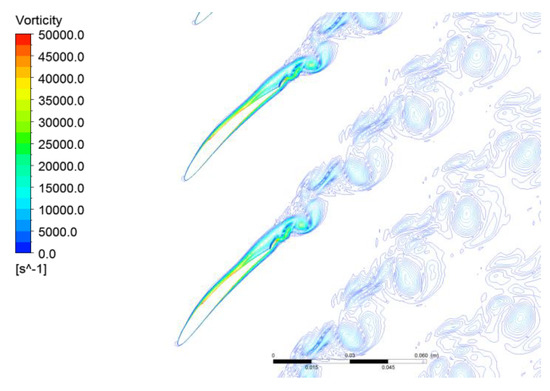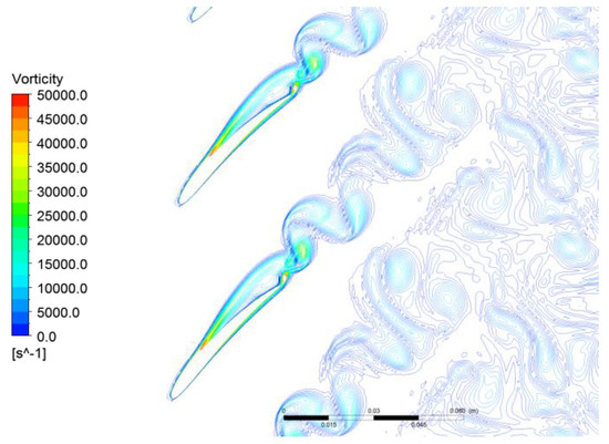For the suppression of suction-side separated flow, the effectiveness of the excitations with the frequency of suction-side separation vortices was checked as the next step. The vortex frequency of the suction surface was not the dominant frequency of the flow field, as indicated in Figure 7. The vorticity of the suction-side separation vortex was about an order magnitude lower than the vorticity of shedding vortices. However, after the excitation at ±5% of the range around the harmonics of Fss, it was shown as a remarkable negative separation control effect, as expressed in Figure 13. In order to investigate the mechanism for the negative effect, the computation example with the excitation at the frequency of seven times of the RF was analyzed here. The instantaneous vorticity contour under excitation was presented in Figure 16. With the excitation, the vortex on the suction side separated forward to the leading edge of blade. And the structure of the vortices became disordered, and the flow field deteriorated markedly. The separation flow increased the flow instability and could even cause stall flow in the cascade. Loss distribution in Figure 15 showed that the pressure coefficient at the cascade exit dropped sharply, and the average pressure loss downstream of the blade increased significantly. Excitation that coincided with the eigenfrequency of suction-side separation transfused energy to the separation flow and thus led the separation position forward. This could cause the reduction of the working range and increase the loss in the flow field.