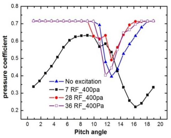 For the traditional method to control the separation of flow field, it was common to excite the separated flow with the frequency of shedding vortices. Under this condition the working range and total performance of the stage also had been improved, which had been widely investigated by researchers [9,10,11,12,13]. In this section, the excitation by the frequency of shedding vortices on the separation flow was also conducted. As Figure 13 indicated, positive effects were indeed obtained on the control of separation flow at a range of ±12.5% around Fshed.