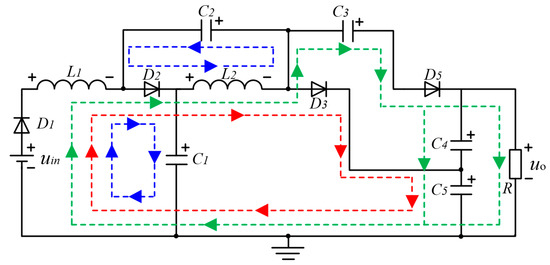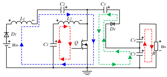 According to switching states of the power switch Q, the topology has two operation states. It is assumed that the inductors, capacitors and power semiconductors in the topology are ideal components. The Kirchhoff voltage law and current law are applied to analyze the topology operation principle. When the power switch Q is turned on, the operation state of the circuit is as shown in Figure 2. Diodes D2, D3 and D5 are turned off and four current loops appear in the circuit. The output voltage of fuel cell uin and capacitor C2 charge inductor L1 through diode D1 and power switch Q. C1 charges L2 through Q. C5 charges C3 through D4 and Q. C4 and C5 in series transfers the energy to load R. Equations (1) and (2) can be obtained from Figure 2.