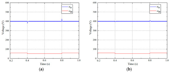 The load resistance is 400 Ω and the reference output voltage is 400 V. When the input voltage jumps between 50 V and 60 V, the output voltage uO and input voltage uin are as shown in Figure 6.