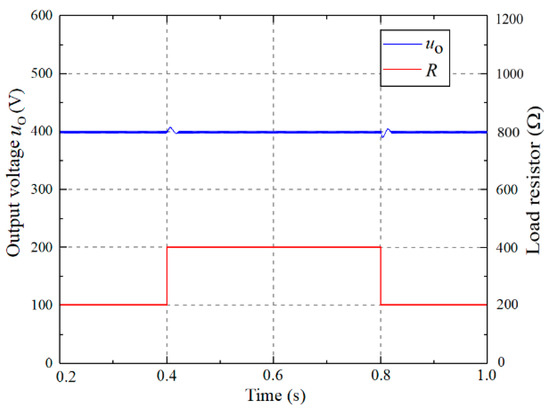 In the process of fuel cell vehicle driving, the vehicle demand power changes frequently, which requires fast dynamic response performance and an excellent ability to resist load disturbances for the converter. The output voltage is as shown in Figure 7 during load 50% step change. When the input voltage is 40 V and the reference output voltage is 400 V, the load resistance jumps between 400 Ω and 200 Ω. In Figure 7, it can be observed that the output voltage maximum excursion is less than 3% and the adjustment time is less than 30 ms during load 50% step change.