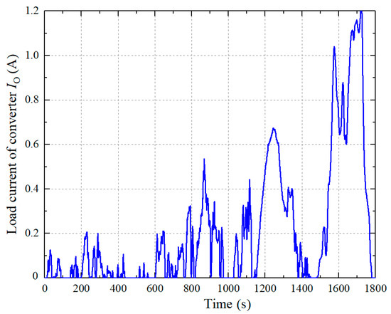 The fuel cell vehicles typically use the compound energy system, which consists of a fuel cell and an ultracapacitor. The bi-directional DC–DC converter is used between the ultracapacitor and the DC bus to provide instantaneous power or to recover braking energy. When the required power Pload in Equation (30) is less than zero, the vehicle is recovering energy. The quasi-Z-source network DC–DC converter in this paper is used between the fuel cell and the DC bus only to provide power for the vehicle. Therefore, the vehicle load demand power Pload is limited to zero when the Pload is less than zero. Then, the vehicle load demand power Pload is scaled down in order to be less than the converter’s rated power. The simulation result of the converter load current is shown in Figure 9. In order to track the load current variation of the converter, the output current of the fuel cell is shown in Figure 10. The output voltage of the fuel cell is shown in Figure 11.