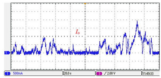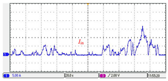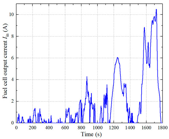The load current waveform is shown in Figure 20 and changes with the load demand power. The output current waveform of the fuel cell is shown in Figure 21 and can follow the load current variation. Due to the “soft” output characteristic of the fuel cell, the fuel cell output voltage in the last 80 s reduces overall as shown in Figure 19. In order to maintain the stability of the converter output demand power, the output current of the fuel cell increases accordingly in the last 80 s, as shown in Figure 21.
