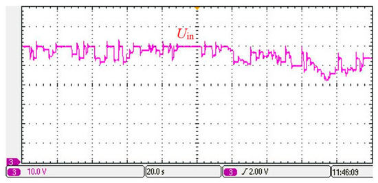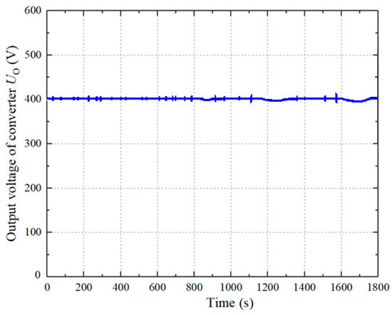 During the input voltage disturbance experiment, the output voltage reference value is set at 400 V and the input voltage jumps between 60 V and 50 V. The output voltage waveform is shown in Figure 16.