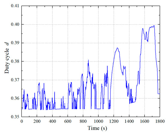 Due to the proposed composite controller, the converter output voltage was maintained at 400 V during the WLTP, as shown in Figure 22. With the fuel cell input voltage fluctuation in Figure 19, in order to maintain the stability of the output voltage, the duty cycle from TMS320F28335 needs to be changed all the time, as shown in Figure 23.