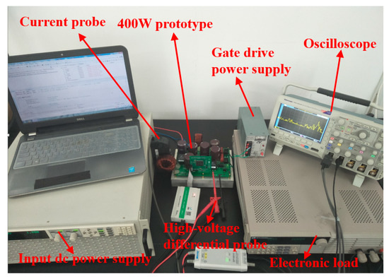 A 400 W experiment prototype was built as shown in Figure 14. The parameters of the prototype are shown in Table 1 and Table 2. The TMS320F28335 is adopted as controller and the MOSFET (IXTK102N30P) is adopted as power switch. The experiment platform is shown in Figure 15. The input voltage and output voltage are measured by the voltage hall sensors.