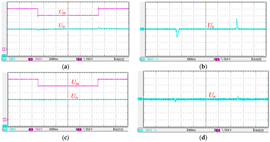 In Figure 16a, the maximum output voltage excursion is around 8% without feedforward compensation. With feedforward compensation, the maximum output voltage excursion is less than 2%, as in Figure 16c. The output voltages in Figure 16b,d are measured by using the oscilloscope AC coupling mode. From Figure 16, it can be verified that the feedforward compensation improves the system’s ability to resist input voltage disturbance.