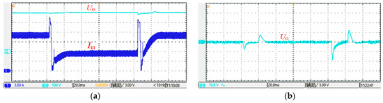 During the 50% load step disturbance experiment, the input voltage is fixed at 40 V and the output voltage reference value is set at 400 V. The load resistance is step changed between 400 Ω and 200 Ω by using the electronic load. The input current and output voltage waveforms of the converter are shown in Figure 17. The input current of the converter can quickly follow the output load variation, providing demand power for the load. The maximum output voltage excursion is less than 5% and the adjustment time is less than 30 ms. The output voltage fluctuation in Figure 17b is measured by using the oscilloscope AC coupling mode. The maximum excursion of the output voltage is slightly higher than that in the simulation; this is caused by the parasitic parameters of the circuits and components. The system shows good dynamic performance during load disturbance.