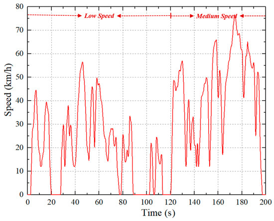 The worldwide harmonised light vehicle test procedure (WLTP) is adopted to test the converter. The WLTP consists of low speed, medium speed, high speed and extra-high speed, as shown in Figure 8 [26,27]. The parameters of the fuel cell used in the simulation are shown in Table 3. The relationship between the demand power and the speed of the vehicle is as shown in Equation (30).