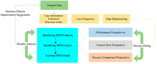 The proposed methodology in this study is presented in Figure 1. As shown in Figure 1, the methodology consists of six stages: case information extraction (previous work), process analysis from a case perspective, data reprocessing, process mining from other different perspectives, PM result analysis based on the Accimap method, and proposing business process improvements suggestions.