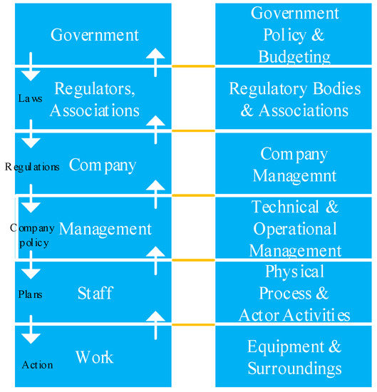 As shown in Figure 2, the risk management framework (left) and Accimap approach (right) by Rasmussen [10,11] are presented. The approach has been widely used in the domain of accident analysis. Rasmussen’s risk management framework depicts a dynamic and complex technique system of society. In the society system, six system levels (government, regulators and associations, company management, technical and operational management, staff, and work) are involved. Meanwhile, the organization hierarchy is characterized by the Accimap approach, to be more specific, government policy and budgeting, regulatory bodies and associations, company management, technical and operational management, physical process and actor activities, and equipment and surroundings [10,11]. The level of equipment and surroundings contains task-related equipment and surrounding in workspaces, such as location, temperature, buildings; the level of physical process and actor activities contains the business workflow and workers in workspaces, and this level describes the relationship of causality and functionality; the level of technical and operational management contains the functionality activities in workspaces, such as decisions and plans in workspaces; the level of company management refers to other task-related companies’ decisions, plans in workspaces; the upper two levers are related to the judgments, decisions, or plans of higher-level regulators (for example, the government or associations).