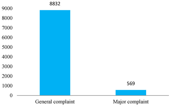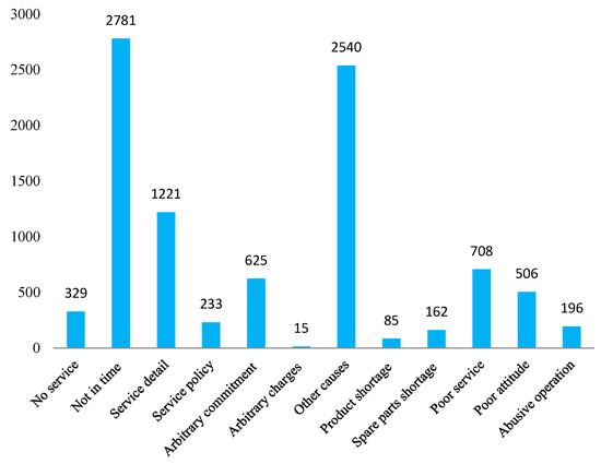 As shown in Figure 3, Figure 4 and Figure 5, in terms of complaint grades, the number of general complaint cases is much more than major complaint cases; in terms of complaint causes, “not in time” and “other cause” are the most frequent causes of complaints; and, in terms of complaint problems, “service complaint” is the most frequent complaint problem.