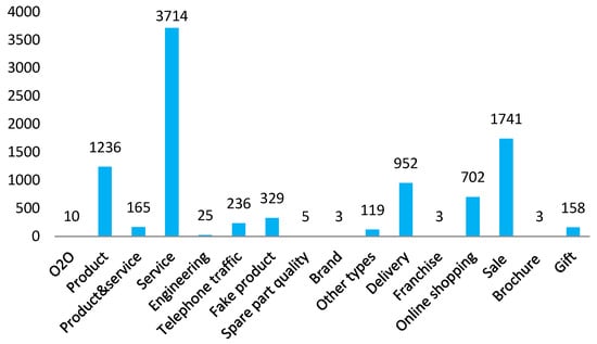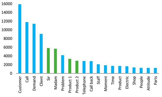 Figure 5 presents the statistical results of noun frequency in the natural texts of complaint contents. In Figure 5, the words of “sir” and “madam” almost share the same frequency. We can conclude that the frequency of male and female customers is similar in the company’s CHS process. Besides, the words of “product 1” and “product 2” share the maximum frequency compared with the company’s other products in the company’s CHS process.