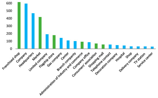 Figure 6 presents the statistical results of institutional suffix frequency in the natural texts of complaint contents. In Figure 6, we can find that “franchised shop”, “market”, “flagship store”, and “shopping mall” are the main shopping channels to buy the company’s products for customers. In the meantime, the main complaint channels outside the company for customers are “administration of industry and commerce”, and “customers’ association”.