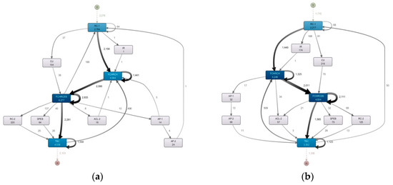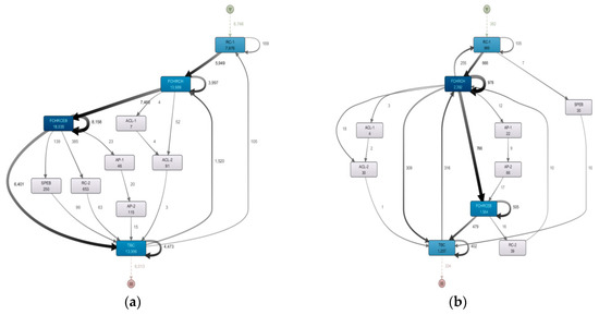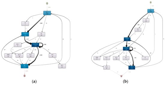 Figure 11 presents the mining results of different complaint causes by Disco 2.2.1 [36]. For both two types of CHS cases, the most frequent activity is FCHRCEB. As far as the differences between the two are concerned, ACL-2 follows FCHRCEB in “not in time” cause CHS cases and ACL-2 follows FCHRCEB or FCHRCH in “other cause” CHS cases.