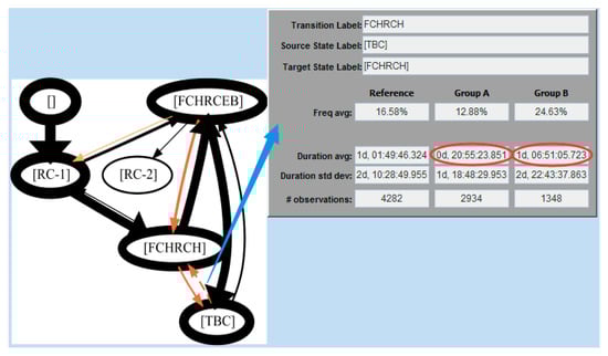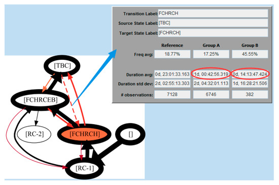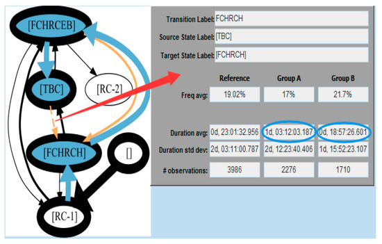 The business process comparison results of “not in time” cause complaint and “other cause” complaint are as presented in Figure 12 [39]. The control-flow difference of the “not in time” cause complaint and “other cause” complaint is 44.44%. The activity of FCHRCH in blue oval show that it is executed more frequently in “not in time” cause CHS (89.72%) (group A) than in “other cause” CHS (80.12%) (group B), and the activities of TBC and FCHRCEB share the similar characteristics. In terms of the handover of different activities, RC-1 → FCHRCH, FCHRCH → FCHRCEB and FCHRCEB → TBC are more frequently in group A compared with group B. FCHRCEB → FCHRCH and TBC → FCHRCH are less frequently in group A compared with group B. In terms of the activity handover efficiency for TBC → FCHRCH, the performance of group A is much poorer than group B.