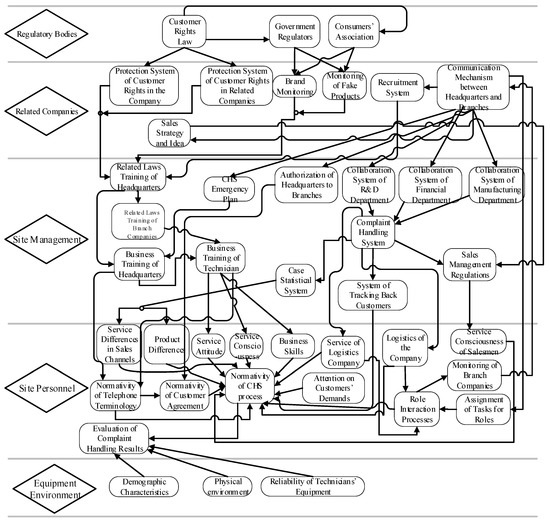 The regulatory level consists of three factors: customer rights laws, government regulators, and consumers’ association; the related company level consists of seven factors: brand monitoring, fake products monitoring, recruitment system, and so on; the site management level consists of 13 factors: CHS case statistical system, CHS emergency plan, sale management regulations, and so on; the site personnel level consists of 16 factors: CHS skills, service attitude, product difference, and so on; and the equipment environment level consists of three factors: demographic characteristics, physical environment, and equipment reliability. Causality may exist among different factors in the same level or different levels.