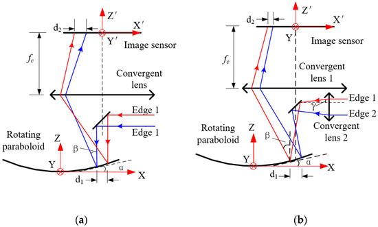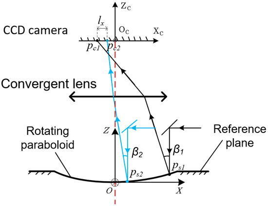 According to the above analysis, the quality of the imaging spot is poor when the collimated light beam is reflected by a rotating paraboloid. Therefore, the system has been optimized by using a focused light beam instead of a collimated light beam. The schematic of the optimized measurement system is shown in Figure 5b.