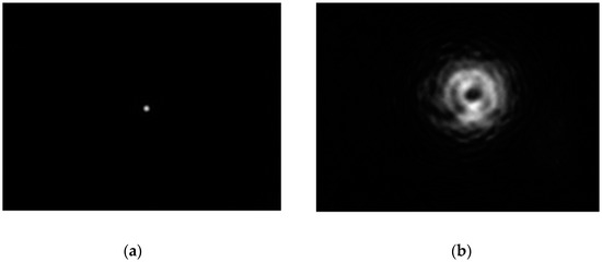 A charge-coupled device (CCD) camera (pixel number 2592 × 1944, pixel size 2.2 μm × 2.2 μm) was used as a laser receiver for the convenience of subsequent signal processing, in which the intensity of the spot image was represented by a pixel value (ranging from 0 to 255). However, the quality of the beam spot, which converged on the camera, was worse when it was formed by the rotating paraboloid rather than by a plane. If the measuring beam was reflected by a plane, the beam spot at the focal plane of the convergent lens converged to a point, as shown in Figure 4a. Unfortunately, when the measuring beam was reflected by the rotating paraboloid, the imaging light spot was dispersed, which caused difficulty in calculating the accurate position of the center point, as shown in Figure 4b. In order to clearly show the shape of the spot in Figure 4b, we showed the image near the spot, which caused the spot to seem bigger than its normal size.