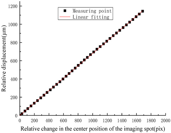 In actual experiments, the slope sensor was calibrated in four different directions on the rotating paraboloid. The experimental results show that the relative displacement of the center point of the imaging spot is linear with the relative displacement of the slope sensor. The relationship between the relative displacement value of the slope sensor and the relative displacement value of the center point of the imaging spot could be obtained by linear fitting of the measured data. The results of linear fitting are shown in Table 2.