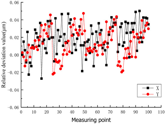 In order to evaluate the stability of the measurement system, experiments were continuously conducted on a single point of measurement. In the actual measurement experiment, the measurement within the range of a single rotating paraboloid could be completed in 4 h and the imaging spot position was sampled 100 times. The Figure 9 gives the deviation curve of the spot position relative to the starting position in the direction of X and Y.