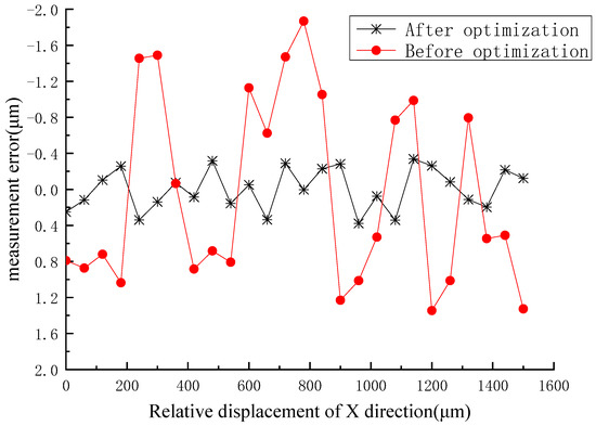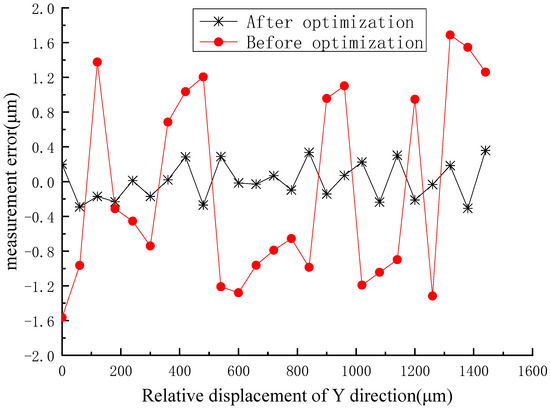 It can be seen from the error curve that the error of the measurement system before optimization was within ±2.0 μm, however, the deviation of the optimized system was no more than ±0.4 μm within the range of the measurement of 1500 μm.