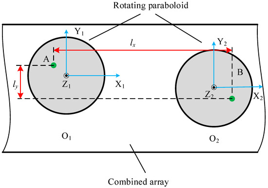 The measurement range of a combined array in this paper was 450 mm in the direction of X and Y. In particular, the distance between the center of adjacent rotating paraboloids was 50 mm. Of course, the precise distance and angle between each rotating paraboloid were calibrated before. The relative position of the center point of each rotating paraboloid on the combined array could be calibrated by laser interferometer and coordinate measuring machine (CMM) (Hexagon, Stockholm, Sweden). The schematic of detecting two positions on different rotating paraboloids is shown in Figure 13.