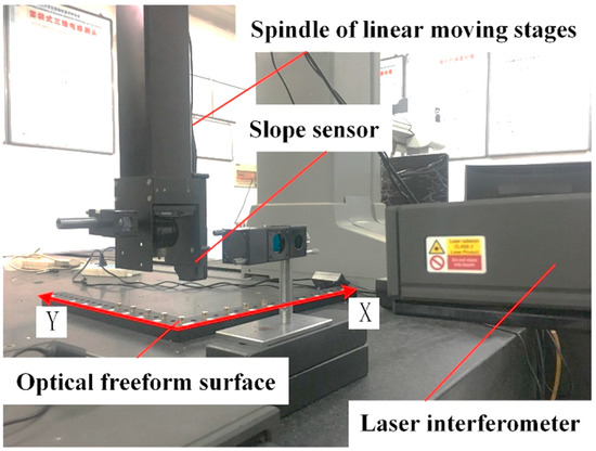 Figure 7 shows the experimental configuration used for calibration experiments. The optical freeform surface is fixed on a stationary platform and the slope sensor is fixed on the spindle of linear moving stages. The slope sensor moves along the x or y direction above the rotating paraboloid by the driving of the spindle, and the relative displacement is measured by a laser interferometer (Renishaw, Gloucestershire, UK) with linear measurement precision of ±0.05 ppm.
