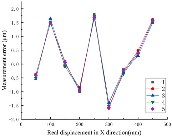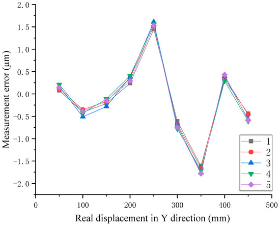 The L-type combined array was placed on a platform. The slope sensor was driven by two-dimensional moving stages and moved in the X or Y direction above a rotating paraboloid in a step of 0.2 mm. Similarly, the relative position of the slope sensor was monitored by a laser interferometer. Figure 14 shows the displacement measurement in the Y direction. The measurement errors could be obtained by comparing the detection values of the laser interferometer with the detection values of the slope sensor. Figure 15 and Figure 16 show the error values of every measurement point in the X and Y direction. The curves of five colors indicated that the experiment was repeated five times.