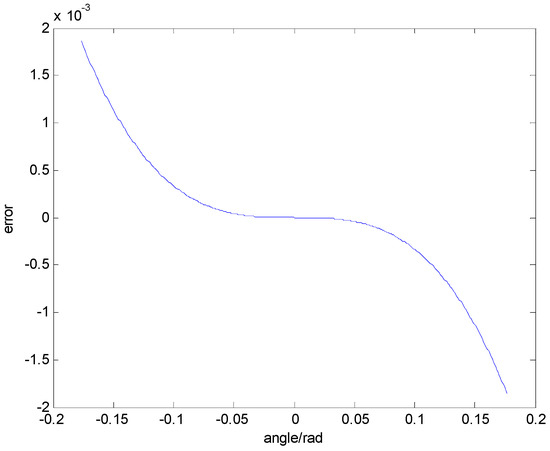 There is a mathematical approximation caused by the principle of autocollimation in an optical slope sensor due to Equation (6). When the opening size of the rotating paraboloid was 2 mm, the corresponding maximum slope was 0.1767 rad. Within this range, there were substitution errors caused by the formula, as shown in Figure 17. The results could be drawn from Figure 16, that the approximate error was particularly small () when the angle ranged from −0.1767 rad to 0.1767 rad. In addition, the error reduced when the focal length of the rotating paraboloid () increased. Linear transformation of the angle and displacement could be achieved due to the rotating paraboloid. Therefore, it was able to accurately measure when the displacement was in a particularly small range. Nevertheless, it was obvious that the precise measurement range of the method of the rotating paraboloid array was discrete. However, the spacing and number of discrete points can be adjusted to suit different environments. In some occasions, such as the measurement of the machine positioning error, there is great scope for application.