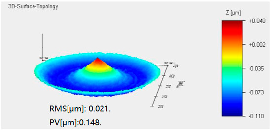 (2) Reducing the processing error of the rotating paraboloid is the basic requirement to ensure the accuracy of the system. At the same time, it is necessary to keep the surface of the rotating paraboloid clean. The surface profile of the rotating paraboloid in the experiment was measured by an optical 3D surface profiler and the testing result is shown in Figure 18. From Figure 18, we can see that the root mean square (RMS) of the surface was 0.021 μm and the value of peak value (PV) was 0.148 μm, which confirmed the manufacturing accuracy of the rotating paraboloid. In particular, a laser with low power (about 5 mW) should be selected and a laboratory environment with controlled temperature and humidity to protect the rotating paraboloid from damage should be used.